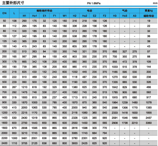 公称通径大小分别有:DN50、DN65、DN80、DN100、DN125、DN150、DN200、DN250、DN300、DN350、DN400、DN450、DN500、DN600、DN700、DN800、DN900、DN1000、DN1200、DN1400、DN1600、DN1800、DN2000、DN2200、DN2400。